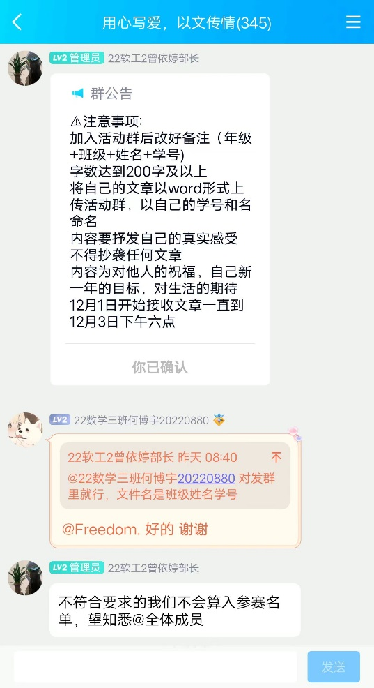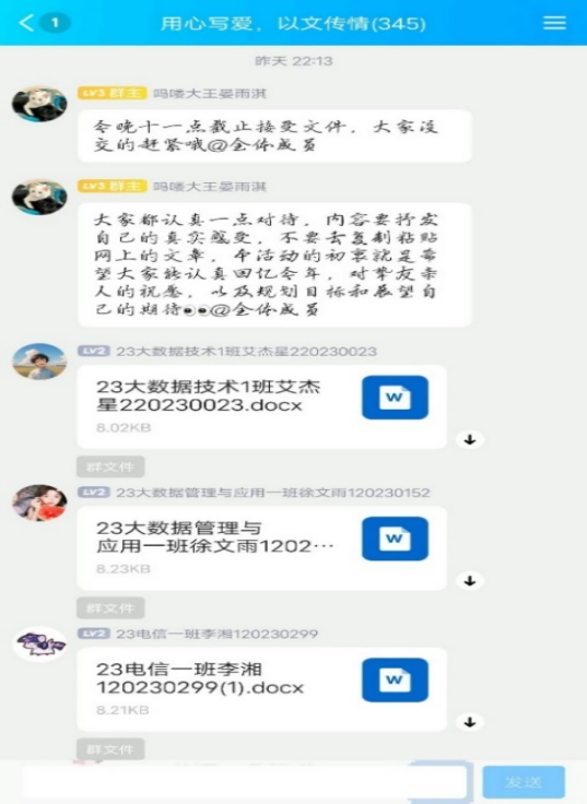2023年12月1日早上9时,电子与信息工程学院学生会在线上开展了“用心写爱,以文传情”活动。活动开展后,同学们都以饱满的热情投入到写作当中,工作人员在群里通知活动信息,收集学生提交的文档进行统计,审核每个人的文章是否符合活动要求,严格检查是否有抄袭现象。