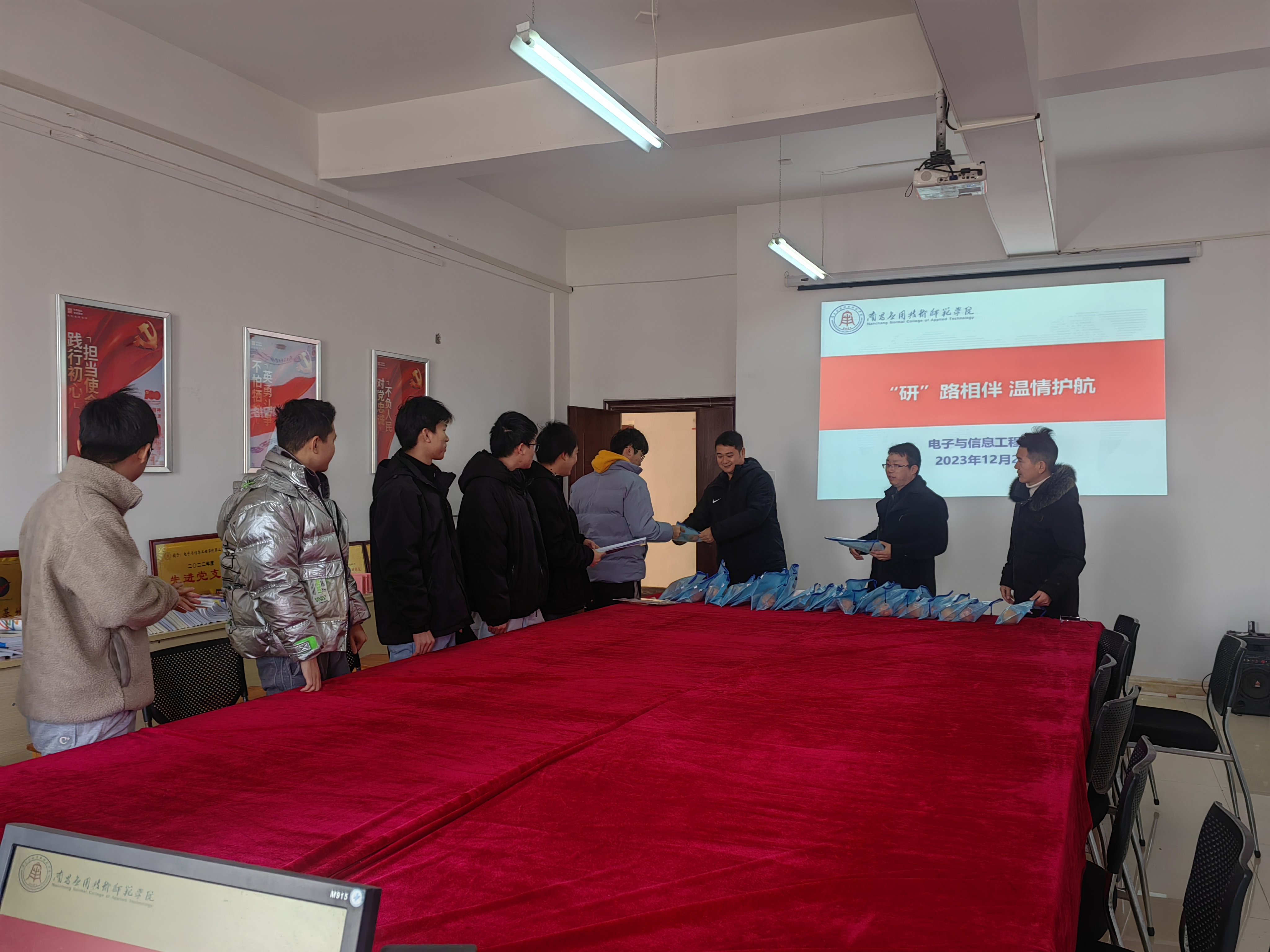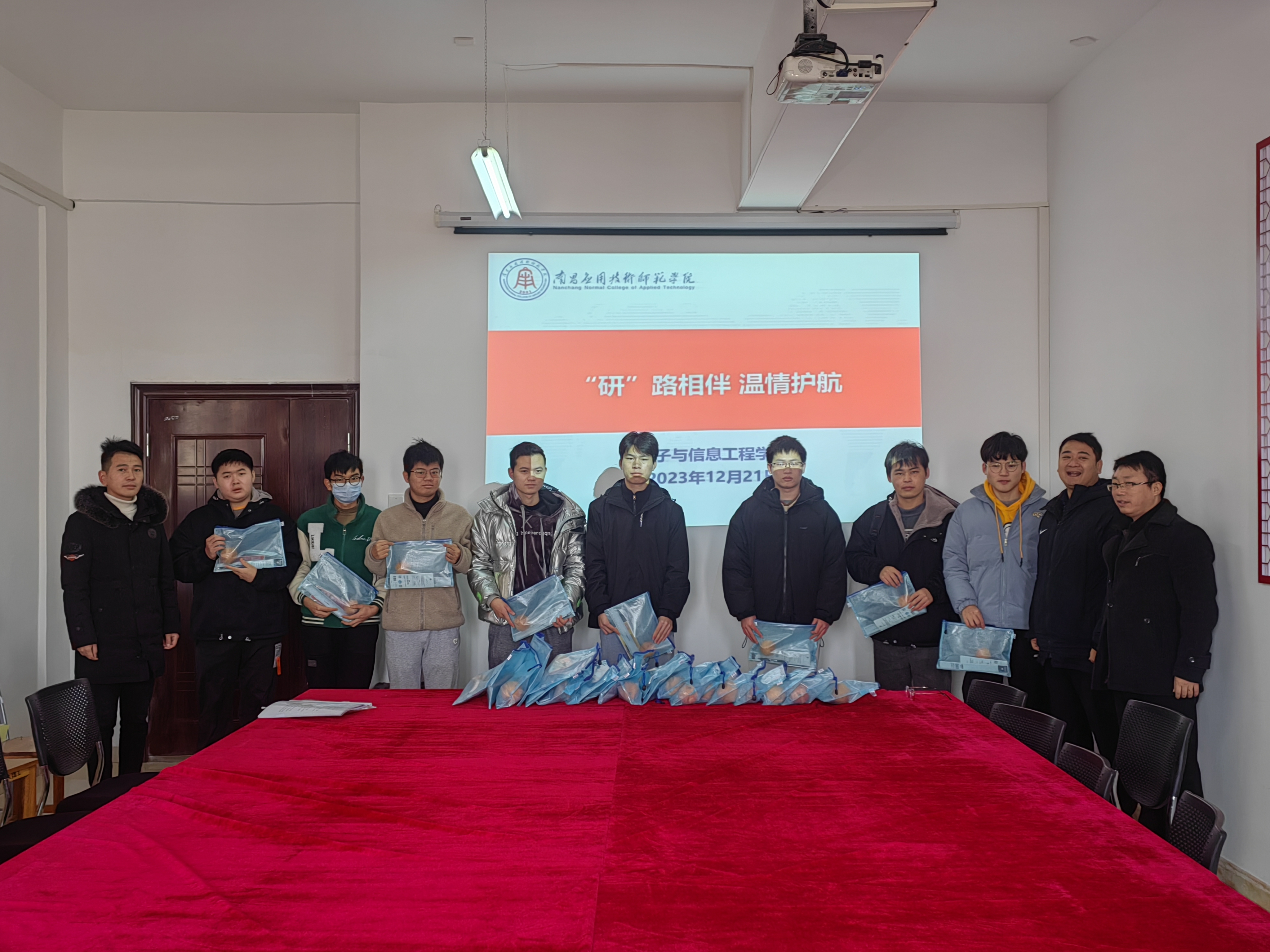 为坚定我院考研学子信心,缓解备考压力,12月21日,电子与信息工程学院党总支书记江建华,副书记黄金标,学院副院长刘军为考研学子送上暖心慰问和真挚祝福,鼓励学子们稳住心态、奋斗到底,保持一股冲劲与韧劲,发挥出自己最好的水平,勇夺佳绩。