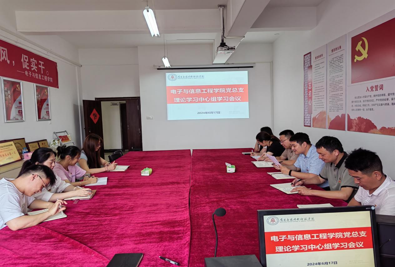 6月17日,电子与信息工程学院党总支召开理论学习中心组学习会议。重点学习贯彻习近平总书记关于全面加强党的纪律建设的重要论述。党总支书记江建华主持会议,经济与管理学院党总支书记龙犇、副书记朱红梅、组织员万佳欣列席旁听会议。