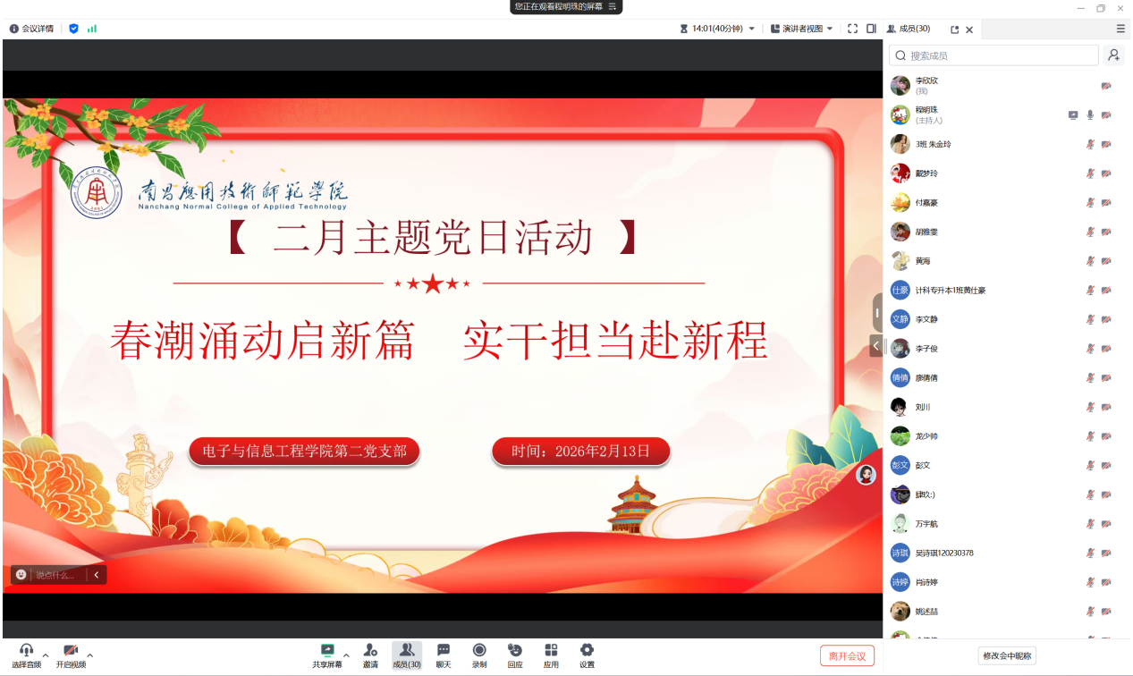 为深入学习贯彻党的二十届四中全会精神,强化党员思想理论武装与纪律作风建设,引导全体党员统一思想、凝聚共识,以过硬作风推动学院事业高质量发展。电子与信息工程学院第二党支部于2026年2月13日线上组织开展“春潮涌动启新篇,实干担当赴新程”二月主题党日活动。