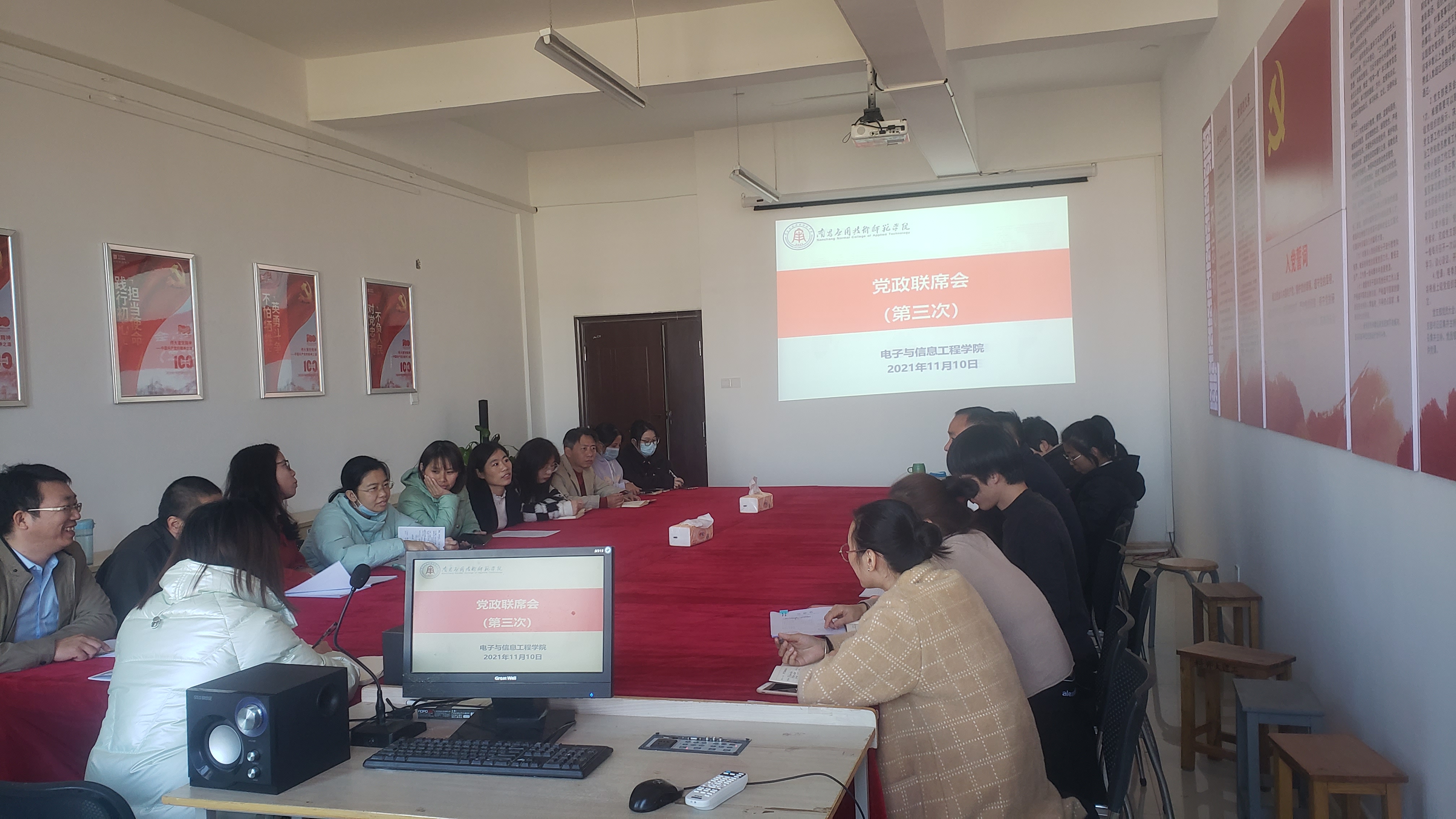 11月10日,电子与信息工程学院在学院会议室召开第三次党政联席会议,全体教职工参加了会议,会议由院长邹水龙主持。