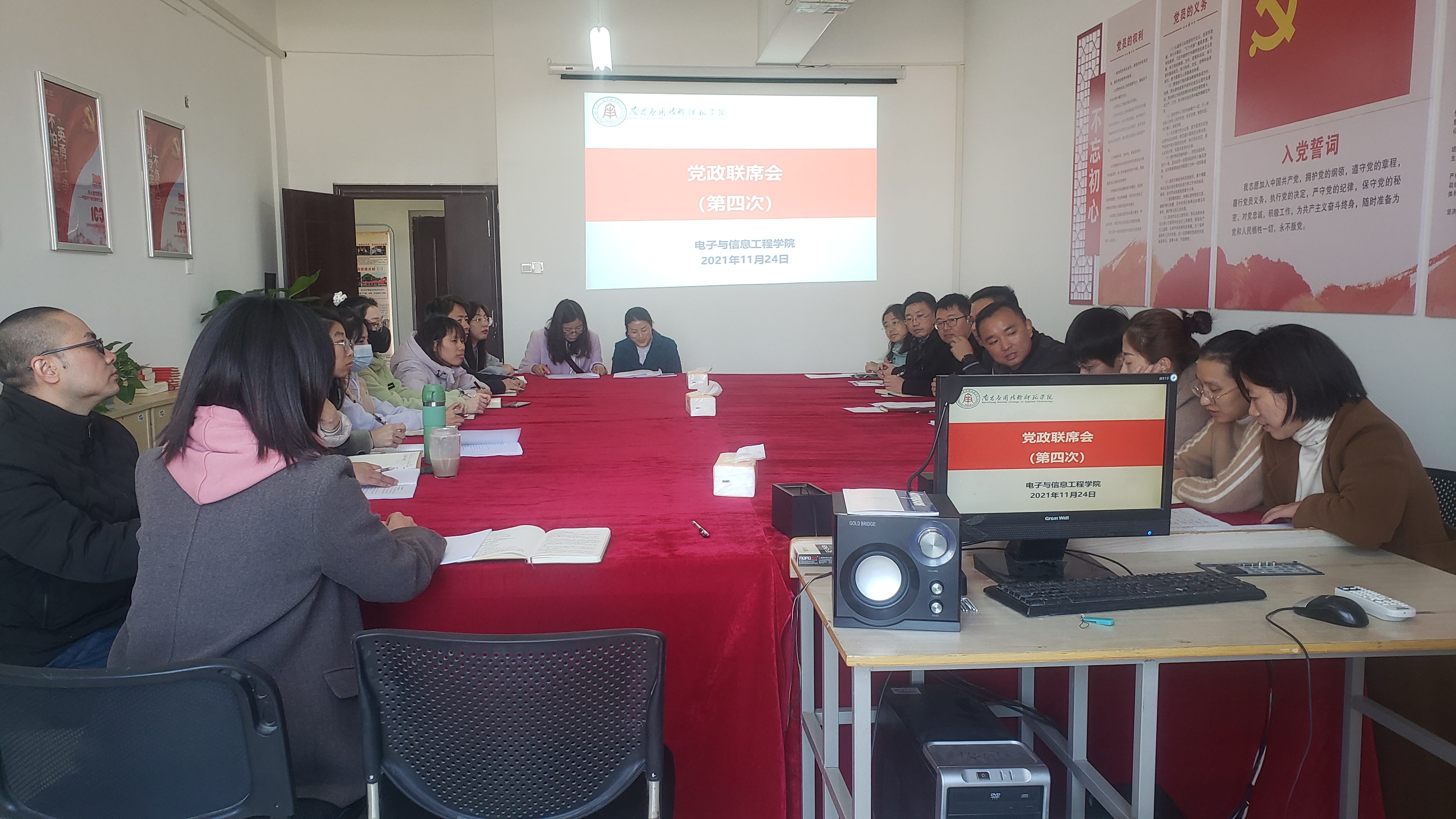 11月24日,电子与信息工程学院在学院会议室召开第四次党政联席会议,全体教职工参加了会议,会议由院长邹水龙主持。