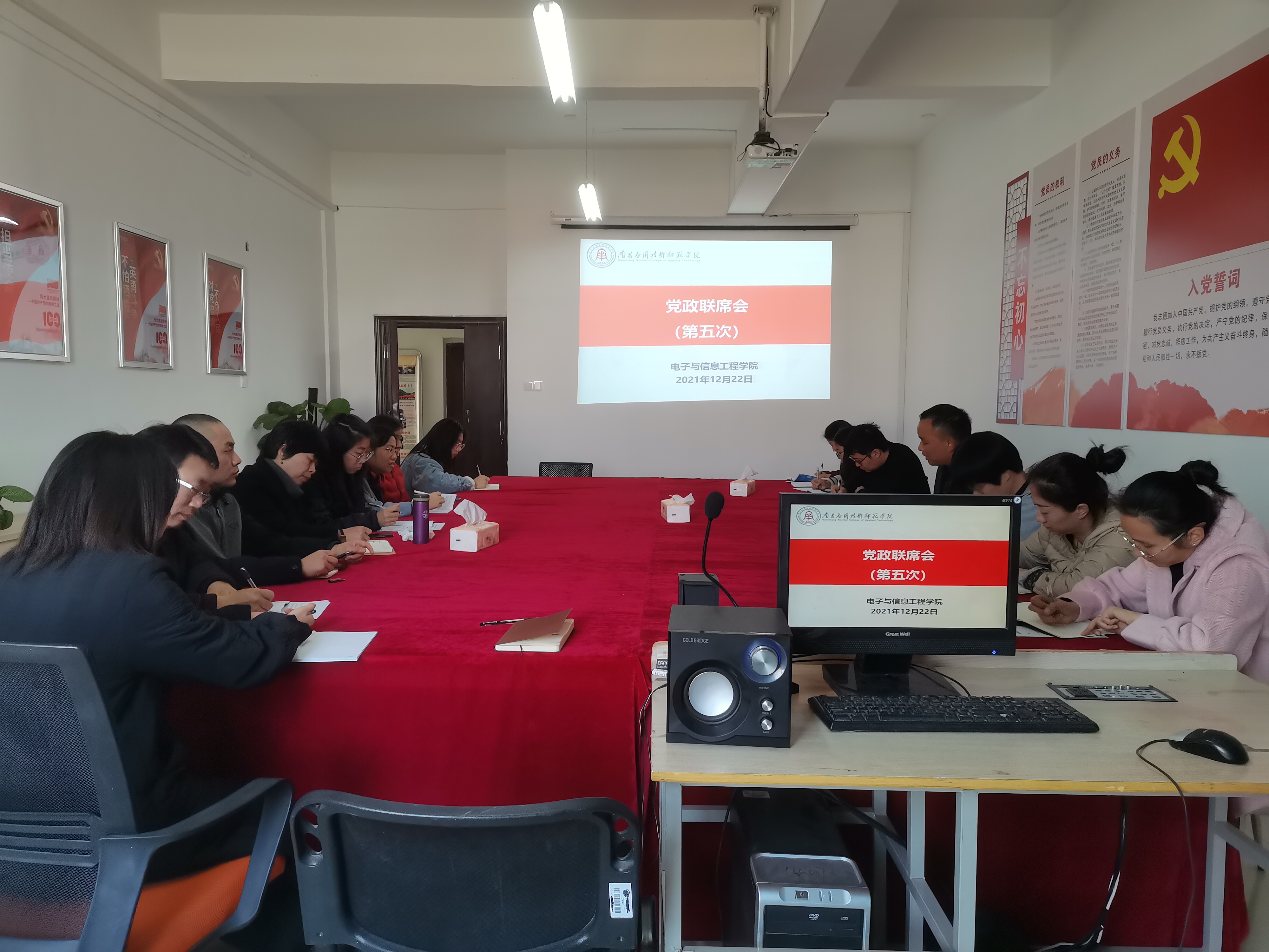 12月22日,电子与信息工程学院在学院会议室召开第五次党政联席会议,全体教职工参加了会议,会议由院长邹水龙主持。